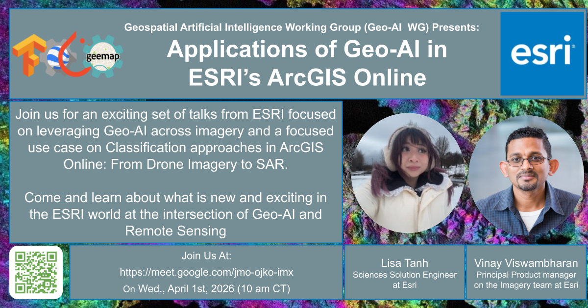 Shared by Emil Cherrington to the Federal GeoAI Community of Practice, originally from 'tjm0042' to the Geo-AI Working Group on Google Groups Hi Geo-AI Working Group, Thrilled for our next talk this Wednesday. We will be joined by Lisa Tanh<https://www.linkedin.com/in/lisa-tanh/> and Vinay Viswambharan<https://www.linkedin.com/in/vinayviswambharan/> Geospatial Artificial Intelligence Working Group (Geo-AI WG) Presents: Applications of Geo-AI in ESRI’s ArcGIS Online Wednesday, April 1st, 2026 (10 am CT) Join at: https://meet.google.com/jmo-ojko-imx (copied from image below, if any issues, please use QR code or URL in image) [cid:e7bff025-3c37-4b70-b637-7f54c4f744de] You received this message because you are subscribed to the Federal GeoAI Community of Practice<https://docs.google.com/document/d/19FNH_f14JdKeViGWvwD-vg_e1KE1Z3oTQgzCE8O5S9Q/edit?tab=t.0#heading=h.y2pmluqmitit>. https://lists.esipfed.org/postorius/lists/esip-federal-geoai.lists.esipfed.o...